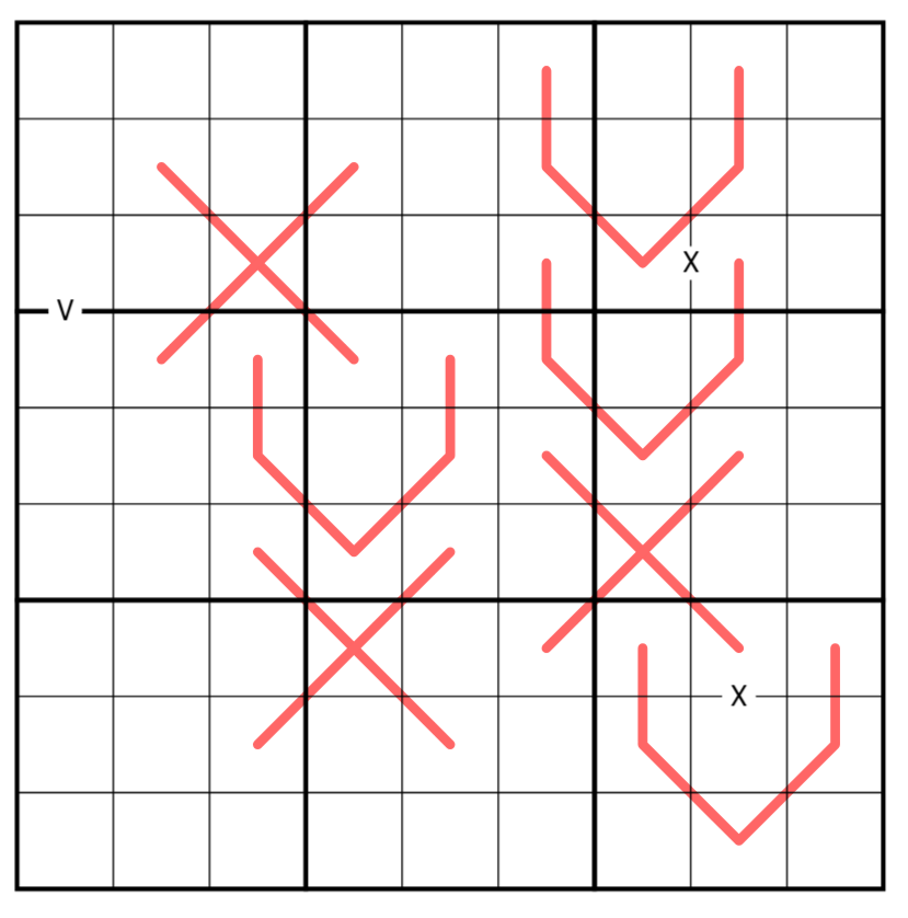 - On X shaped lines, the digits sum to a multiple of 10. On V shaped lines, the digits sum to a multiple of 5