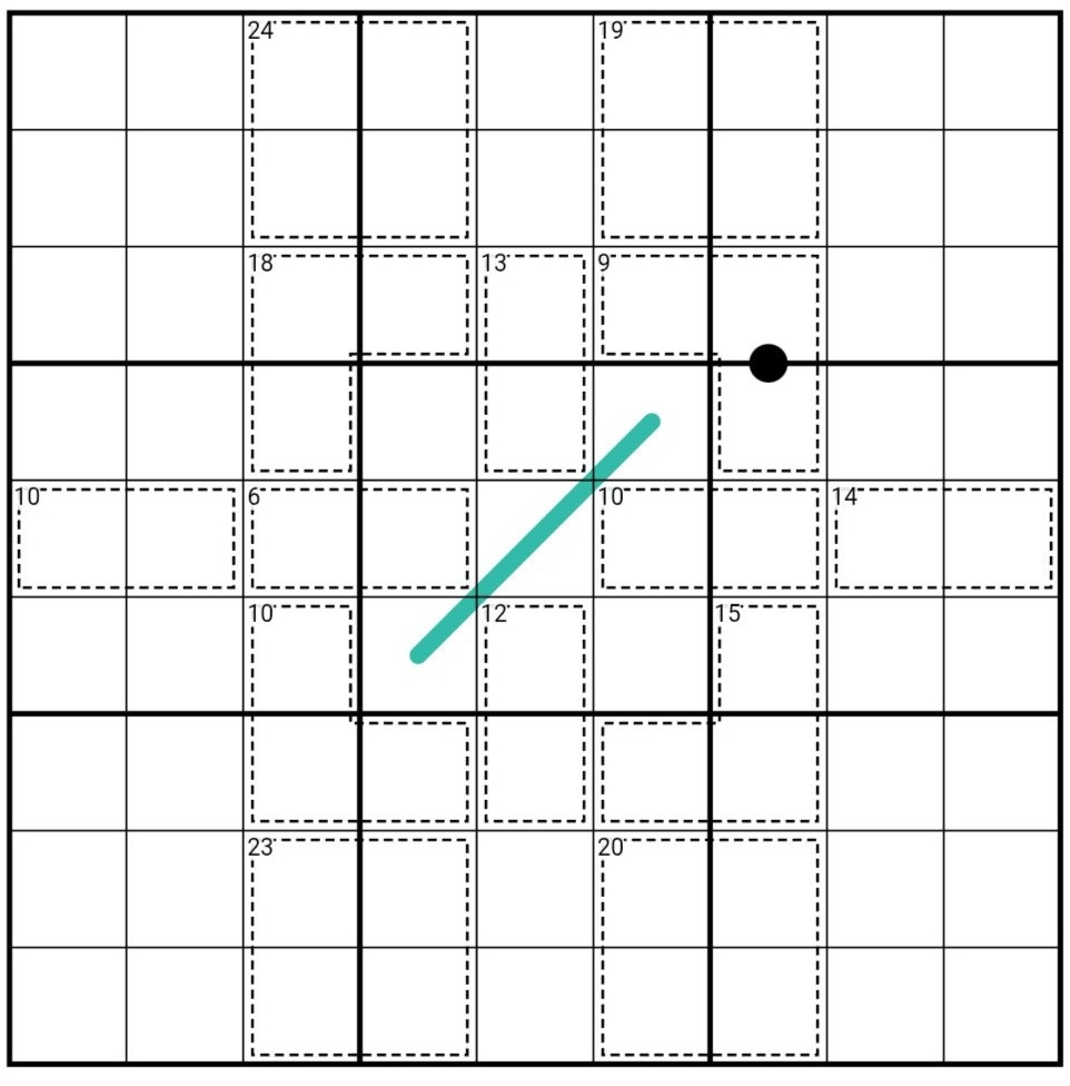 Any set of three sequential cells along a teal modular line contains one digit from (1,4,7), one digit from (2,5,8), and one digit from (3,6,9)