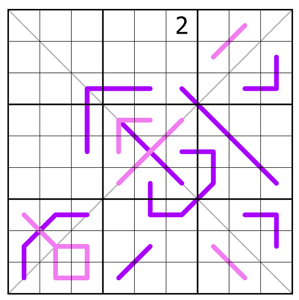 Ziffern auf einer magenta- oder violetten Linie derselben Farbe bilden eine Reihe aufeinanderfolgender Ziffern in beliebiger Reihenfolge, ohne Wiederholungen.