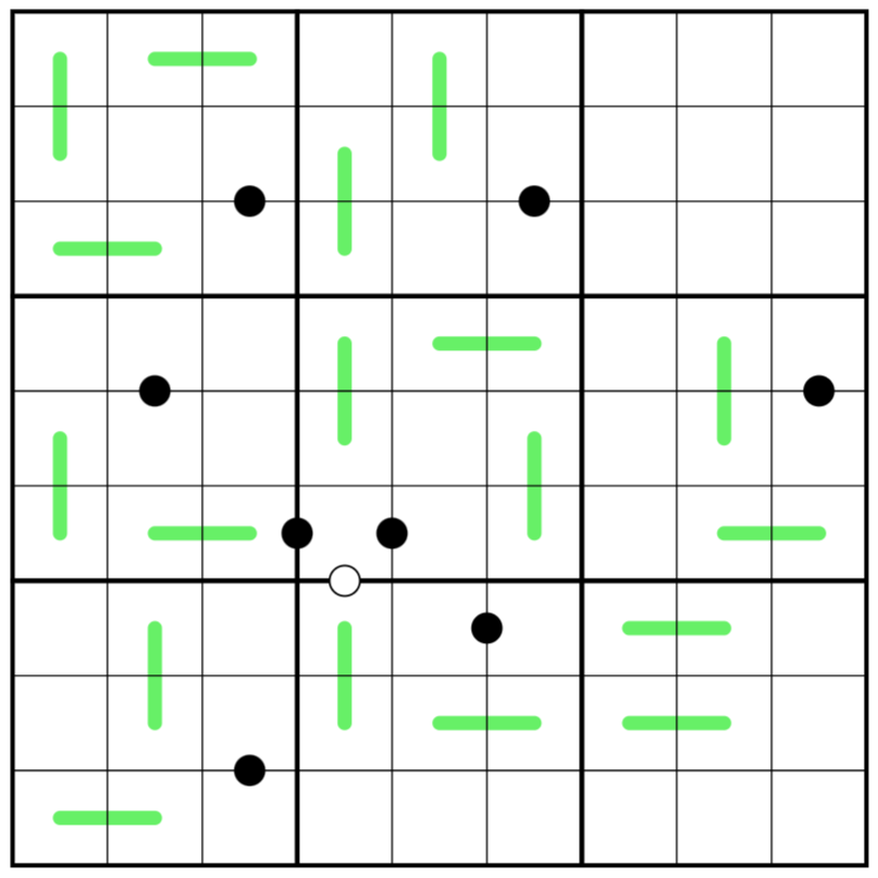 - Digits separated by a white dot are consecutive, digits separated by a black dot are in a 1:2 ratio, ie. one digit is double the other. Not all dots are given