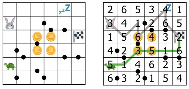 • Racing: The Hare and the Tortoise must separately find a path to reach the chequered flag. A path is an unbranched line that passes through the centers of cells orthogonally or diagnolly. Paths cannot cross each other or themselves. All the cells cannot be visited more than once, apart from the flag where the two paths end.