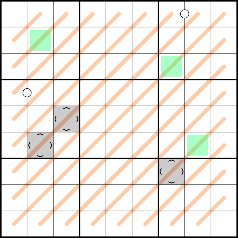 Entropic lines: Every 3 consecutive cells along an orange line must contain a low digit (1,2,3), a middle digit (4,5,6) and a high digit (7,8,9).