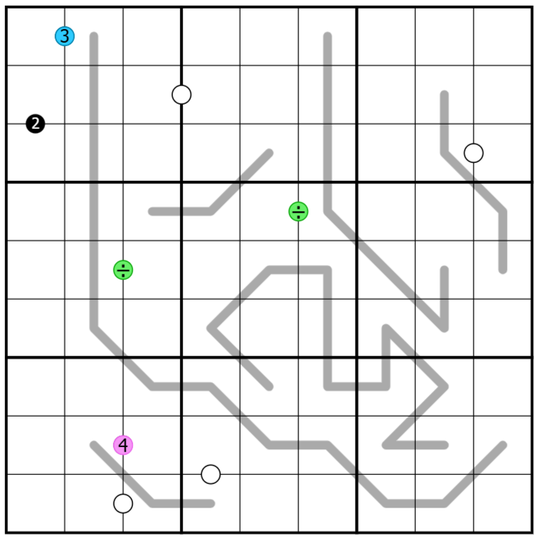 7. Green dots: If two digits are joined by a green dot, one must be an exact multiple of the other, i.e., larger ÷ smaller = N, where N is an integer and may vary from dot to dot.