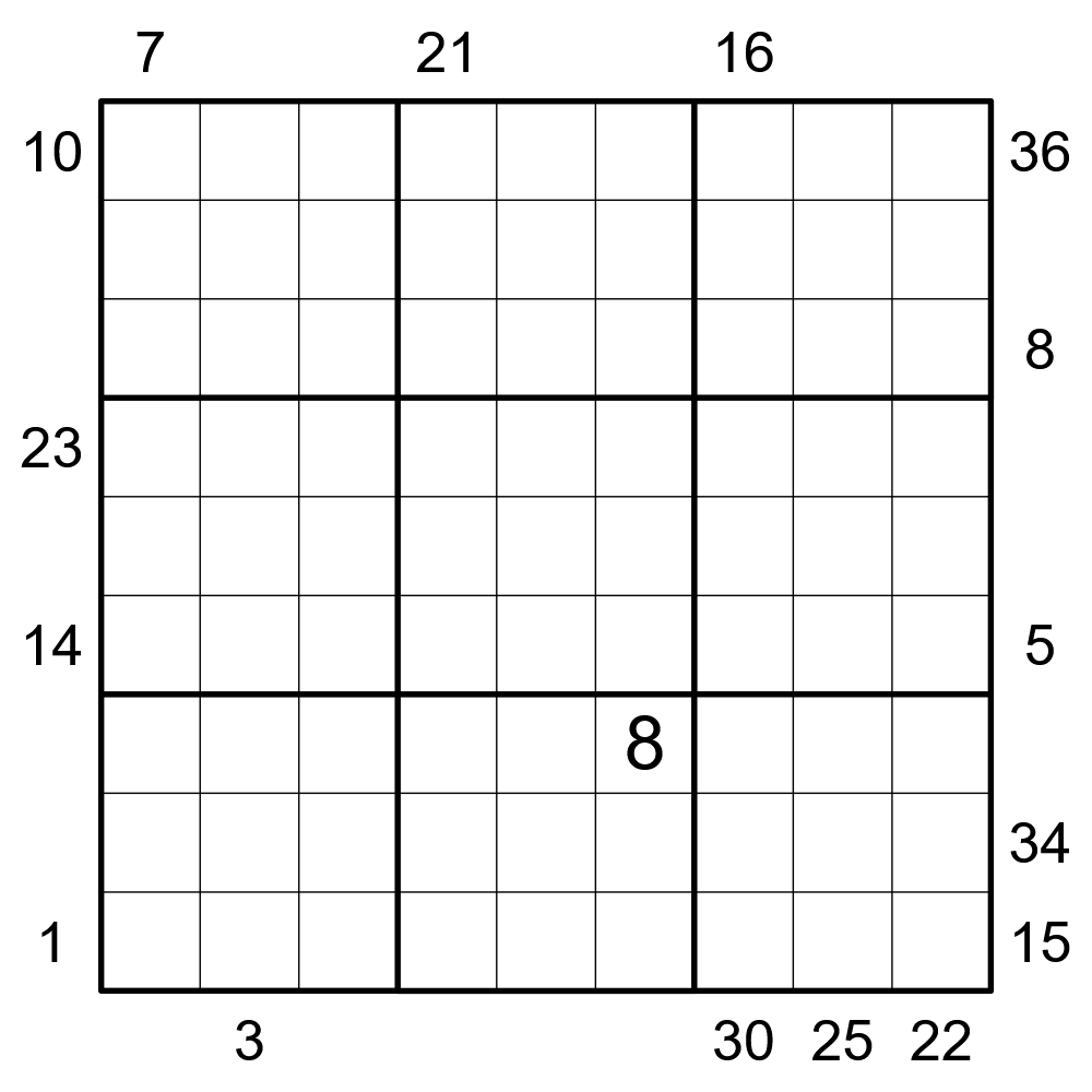 • Clues outside the grid show the rank in ascending order among those 36 numbers for the indicated column or row in the direction of the cell.