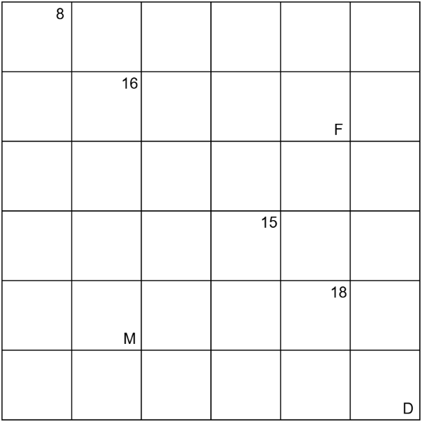 - Ein schwarzer Buchstabe in der unteren rechten Ecke einer Zelle gibt die Rolle dieser Zelle an (F = Farmer, M = Merchant, D = Diplomat).
