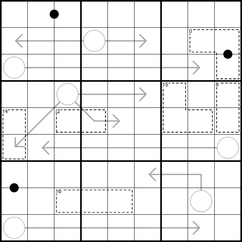 - Kropki dots: Cells connected by a black dot have values with a 1:2 ratio. Not all possible dots are given.