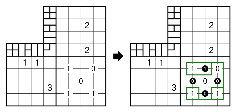 The solver is recommended to keep track of nesting values of non-clued vertices (as shown in the right image), although they are not required for the solution.