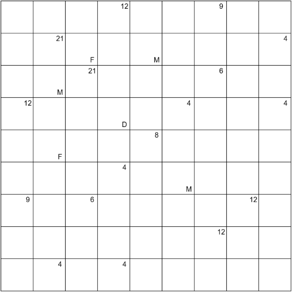 - Ein schwarzer Buchstabe in der unteren rechten Ecke einer Zelle gibt die Rolle dieser Zelle an (F = Farmer, M = Merchant, D = Diplomat).
