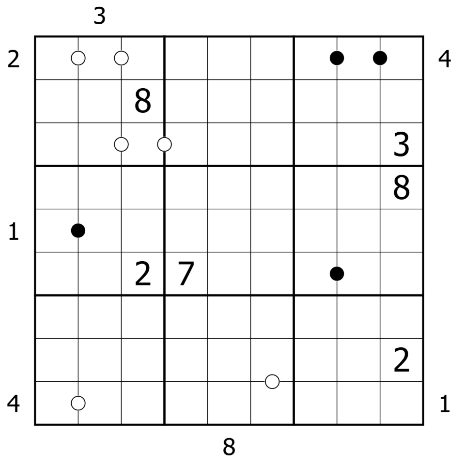 Heights of skyscrapers connected by a white dot must be consecutive and the height of one skyscraper on a black dot must be equal to two times the height of the other skyscraper on that dot. Not all possible dots are given.
