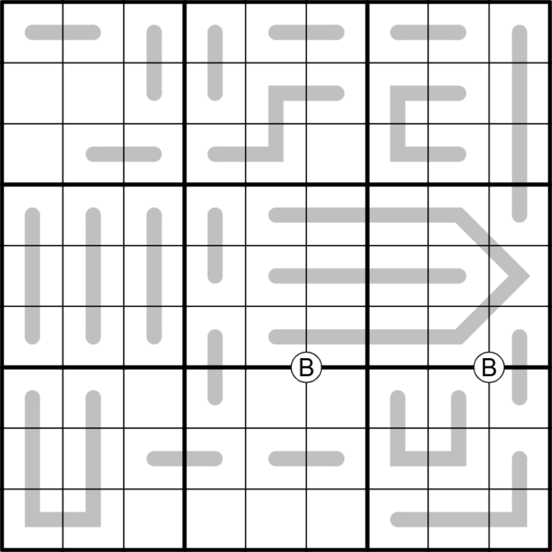 Place 5 As and 4 Bs in every row, column, and 3x3 reigon.