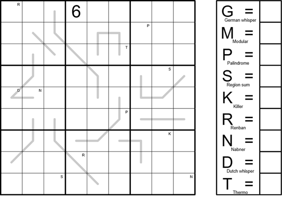 Pair each digit with exactly one of restrictions listed below, such that each unique restriction have their digit counterpart. Lines gain properties from the digits that are on them. Example: If we determine letter G is 5, all lines 5 appears on need to follow german whisper rule. You can freely use notes section on the right of a grid, it will not affect the solution checker whatever you write on it.