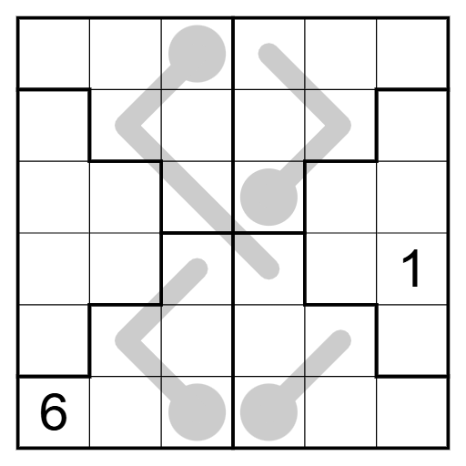 Irregular Sudoku rules apply. Place the digits 1 - 6 once in every row, column and bold outlined region.