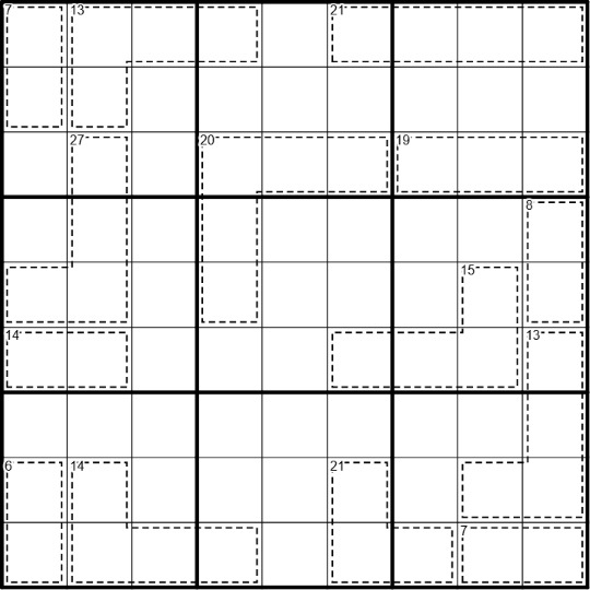 Digits in cages cannot repeat within their cage and sum to the total given in the top left corner of the cage.