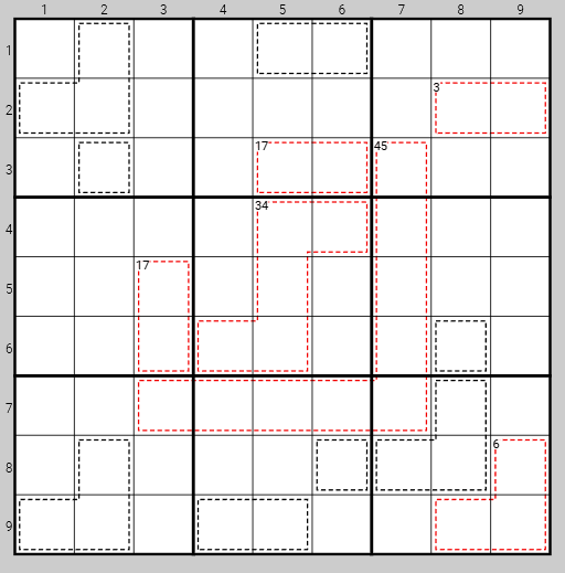 Killer Cages: Digits in cages must sum to the number in the top-left corner (if given) and cannot repeat. If a cage has no given total the cage must still sum to one of the given totals (3, 6, 17, 34, 45).