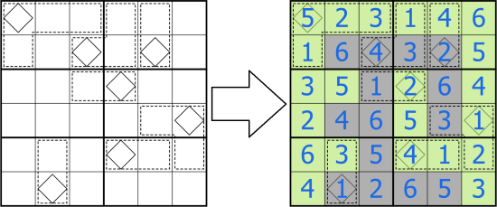 Digits cannot repeat within a cage. The sum of the cells in a cage is equal to the total number of cells the marked diamond cell in that cage sees in all horizontal/vertical directions combined (including itself) that have the same shading as the marked cell. Cells of the opposite shading block the vision.