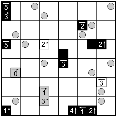 2. Castle wall: Numbered clues indicate the amount of times the loop crosses a cell border in the direction of the arrow. Clues in white cells must be inside the loop, and clues in black cells must be outside the loop. Clues in gray cells may be on either side of the loop. The loop may not be drawn through castle wall clues.