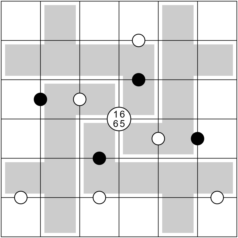 Digits separated by a small white dot are consecutive. Digits separated by a black dot are in a 1:2 ratio.
