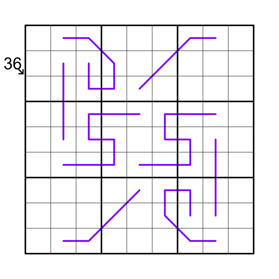 Each violet line contains a set of distinct consecutive digits, and box borders divide it into segments with an equal sum. This sum may be different for different lines.