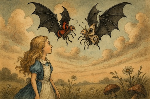 Just then, a flurry of flapping erupted above her head. She looked up and gasped—not one, not two, but a whole parliament of butterflies were dueling mid-air! Their wings were not the soft, fluttery kind one might expect, but leathery and bat-like, flapping with the indignation of a misunderstood poem.