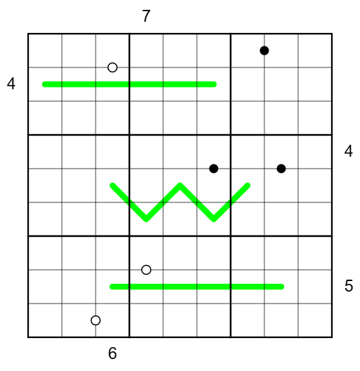 • Kropki Dots: A black dot between cells indicates cell values with a 2:1 ratio. A white dot between cells indicates cells with consecutive values. Not all dots are given.