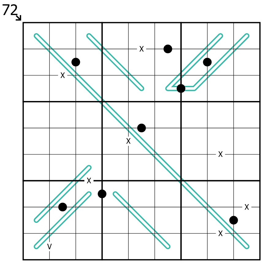 - Modular Lines - along hollow teal modular lines, any group of three neighboring digits must have a digit from each of the following sets: [1,4,7], [2,5,8], and [3,6,9].