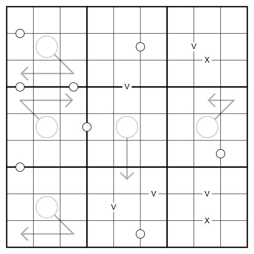 - Kropki Dots: A white dot between cells indicates cells with consecutive values. Not all dots are given.