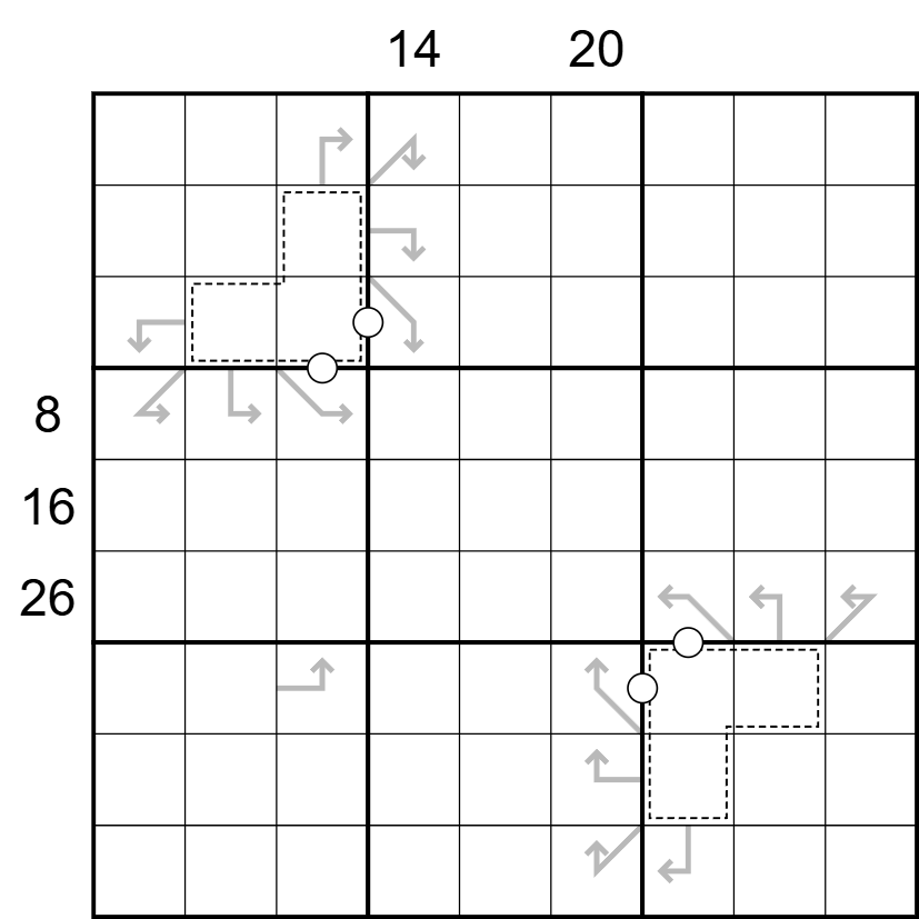 - Slingshots: If a bent arrow is present in a cell, the digit in the cell the arrow comes from appears in the grid in the direction of the arrow at a distance of N cells, where N is the digit in the arrow’s cell.
