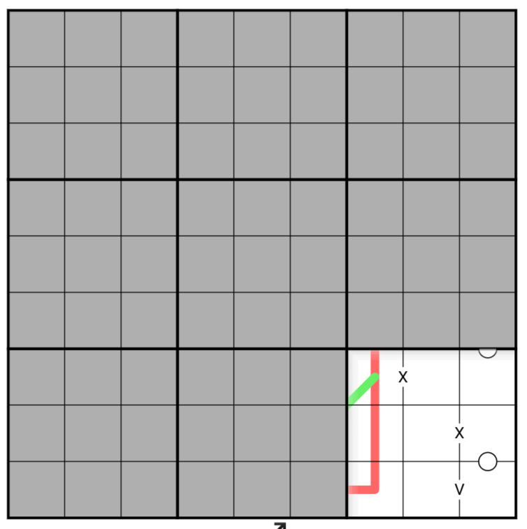 • Adjacent digits along a green German whisper line must have a difference of at least 5.
