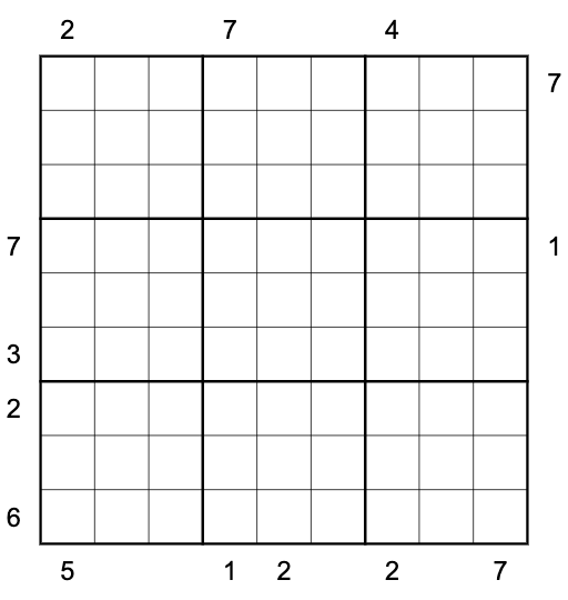 - All outside clues are both Knapp Daneben Skyscraper clues and Knapp Daneben Numbered Rooms clues.