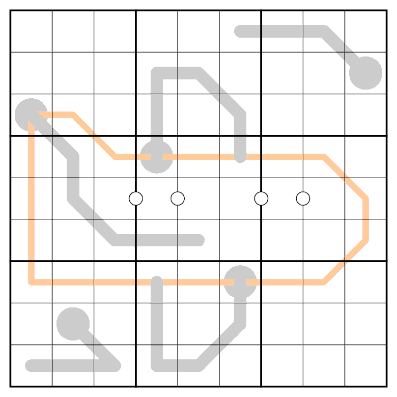 - Digits in cells separated by white dots must be consecutive. Not all dots are given.