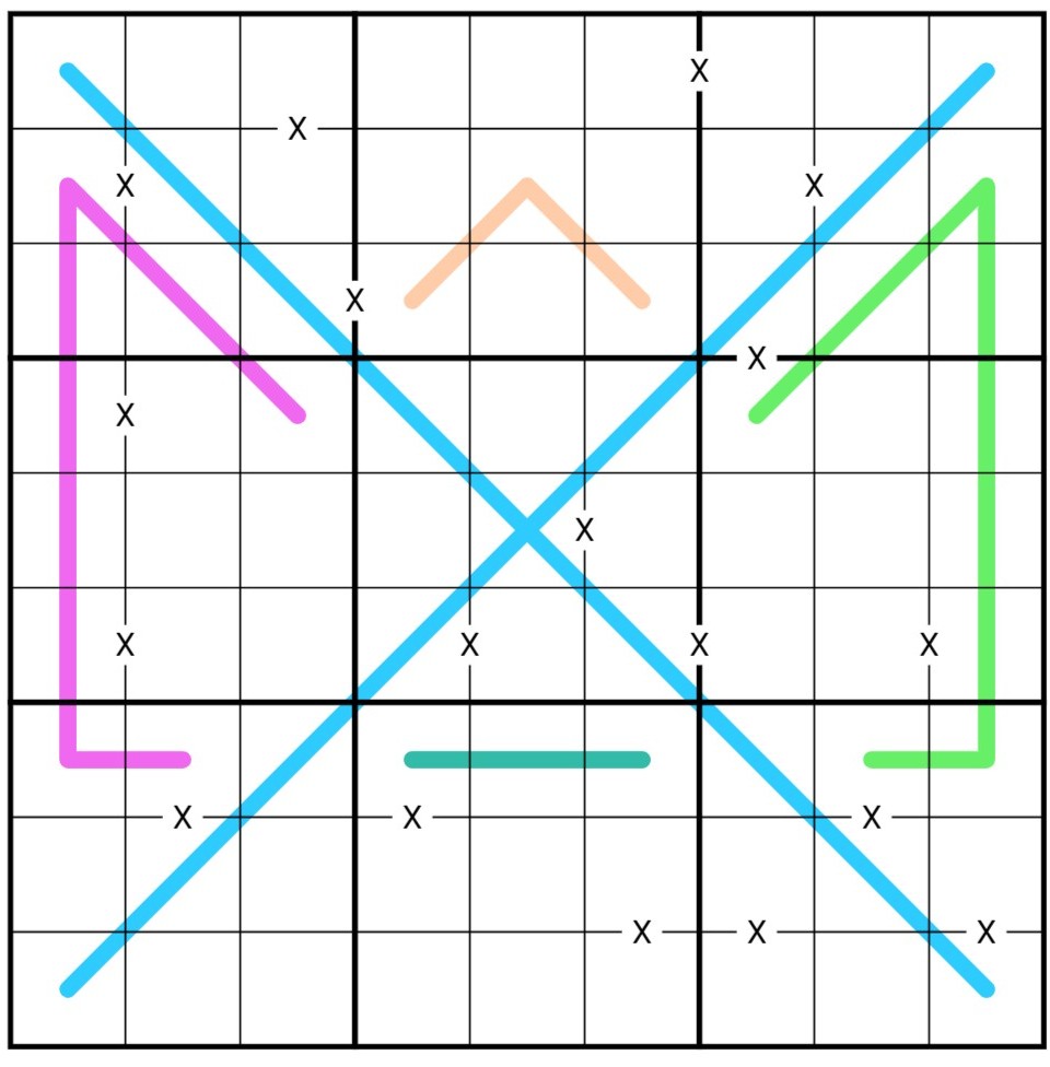 Box borders divide each blue line into segments with the same sum. Both Diagonal blue lines are considered to be parts of the same line.