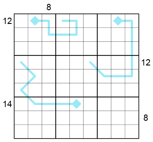 - Index-Linien: Jede türkisene Linie ist eine Index-Linie, d.h. die Ziffer in der N-ten Zelle auf der Linie (beginnend bei dem Diamanten) zeigt die Position auf der Linie an, in welcher die Ziffer N vorkommt. Enthält der Diamant z.B. eine 3, so muss die dritte Zelle auf dieser Linie eine 1 enthalten.