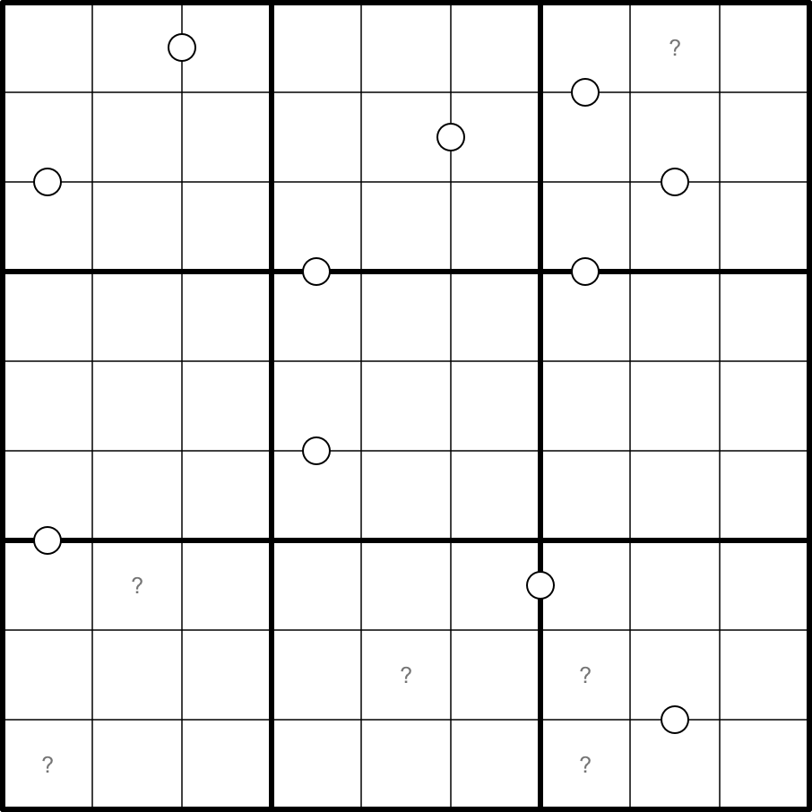 BYO Killer Cages: for each '?,' draw a cage of contiguous cells such that the '?' is both the topmost and the leftmost cell in the cage. Digits may not repeat in cages, cages may not overlap, and the sum of the shaded digits in the cage is given by the '?;'