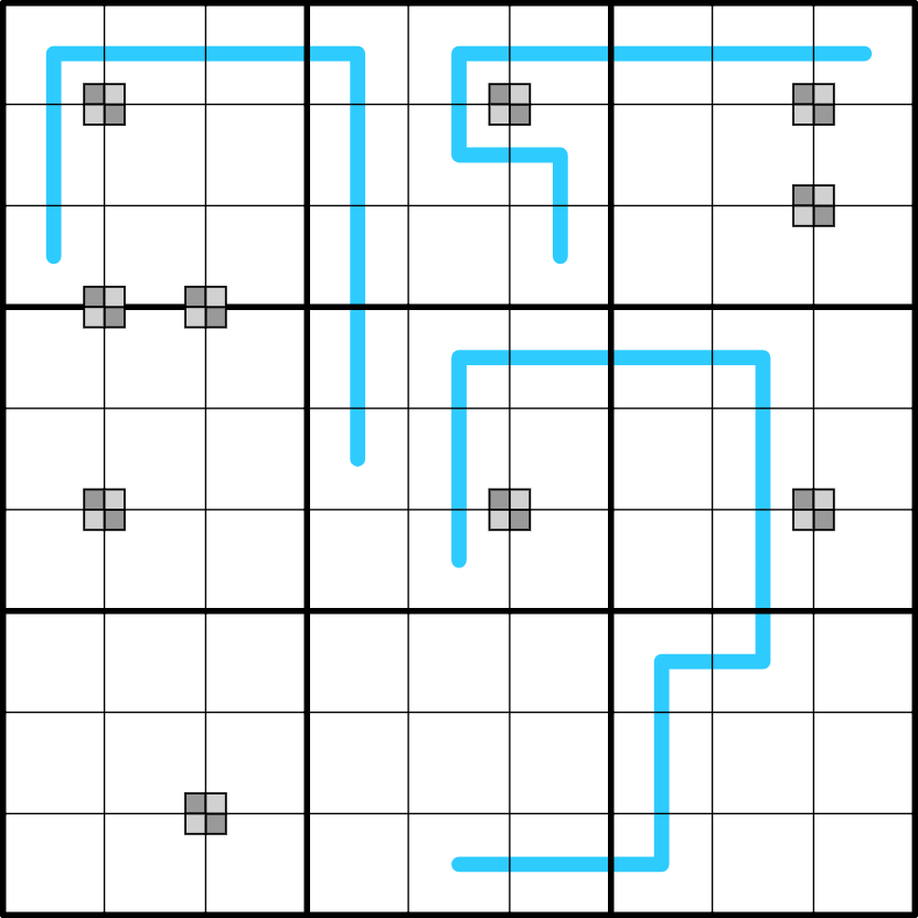Digits on a blue line have the same sum in each 3x3 box the line is in.