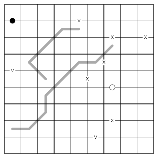 Kropki dots: Cells separated by a white dot are consecutive; cells separated by a black dot must have a 1:2 ratio. Not all possible dots are necessarily given.