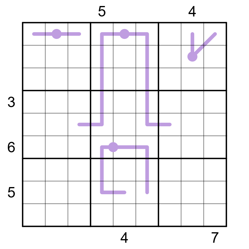 Lavender lines in the grid are zipper lines. Digits equidistant from the line's center must sum to the same value. If a zipper line has an odd number of cells, the central cell's digit defines this sum. [Digits may repeat on these lines if allowed by other sudoku rules.] For example, a valid zipper line could be 3146253 which has a sum value of 6.