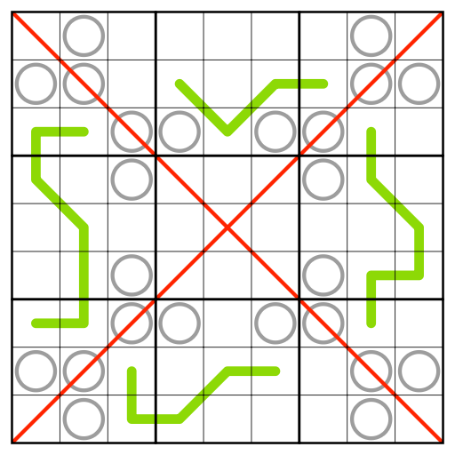Nicht-wiederholende Diagonalen: Ziffern dürfen sich auf den markierten Diagonalen nicht wiederholen.