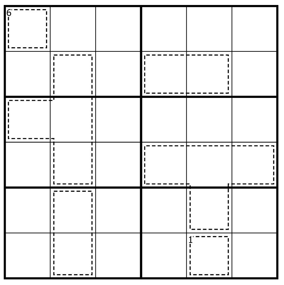 Rules: Normal 6x6 sudoku rules apply (place the digits 1-6 once each in every row, column, and box).