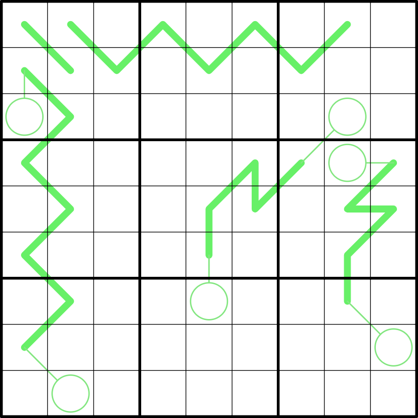 • Split Pea Lines: The sum of the digits strictly between two circles is equal to a concatenation of the two values in the circles, in some order. (e.g. 3_346_1 could be a valid split pea line, as 3+4+6=13.)