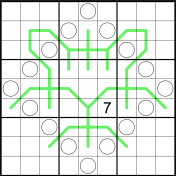 Normal sudoku rules apply. For a digit in a circle, it indicates exactly how many circles contain that digit. Adjacent digits along the green line must differ by at least 5.