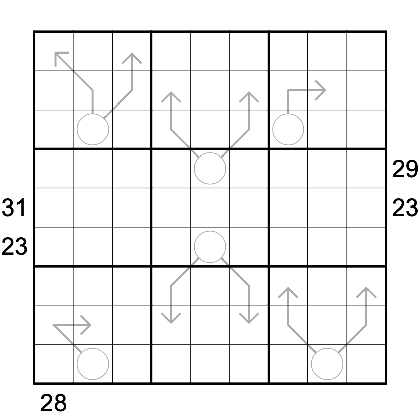 • Arrow: Digits along an arrow must sum to the number in the attached circle.