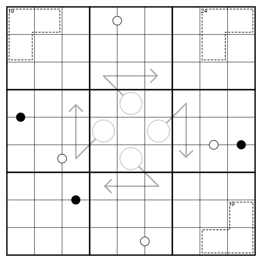 • Kropki Dots: A black dot between cells indicates cell values with a 2:1 ratio. A white dot between cells indicates cells with consecutive values. Not all dots are given.