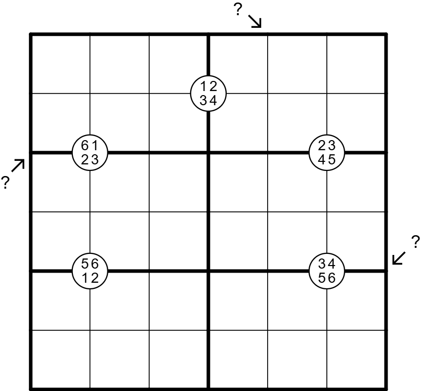 Little Killers: Numbers outside the grid show the sum of digits in the direction of the arrow. Questions marks are values that must be determined by the solver. All question marks represent the same value.