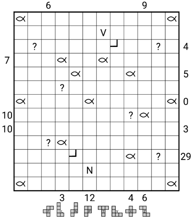 Additionally, from each number outside the grid, draw a path which immediately goes into the nearest cell of the grid and then travels through the centers of some cells until arriving at a fish. Paths may not cross themselves, each other, pentominoes, or fish. The number at the beginning of a path indicates how many cells in the grid the path occupies, including the cell with the fish. Every cell not used by a pentomino must be used by a path. Some path cells are given.