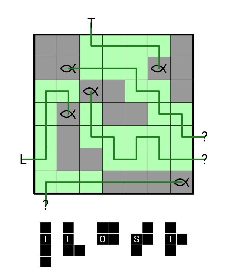 - Jeder Pfad besucht nur das Pentomino, das seinen Fisch enthält, und beim Betreten dieses Pentominos muss der Pfad geradewegs zum Fisch führen, ohne darin abzubiegen oder es zu verlassen.