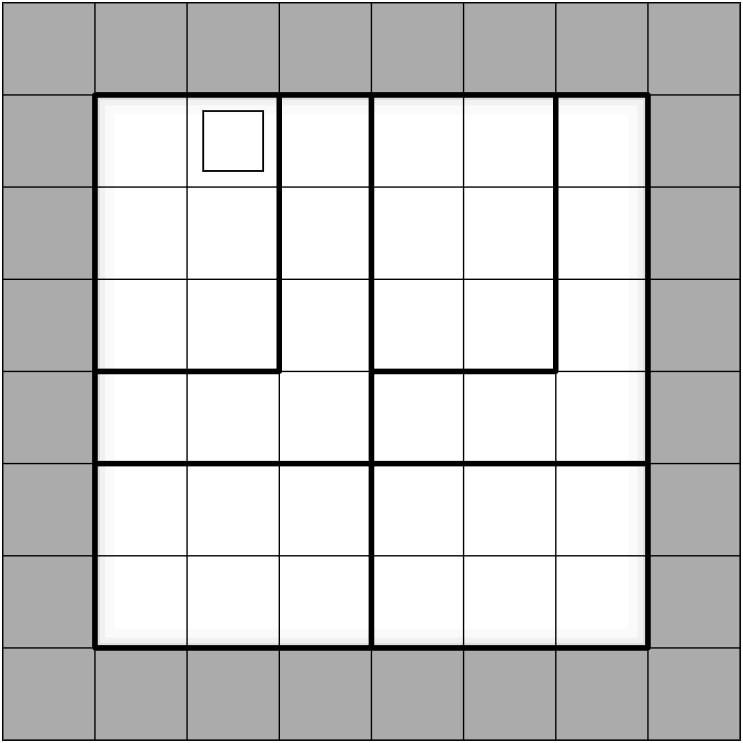 Fill the middle 6x6 area of the grid so that the digits 1 - 6 are placed once in every row, column and bold outlined region.