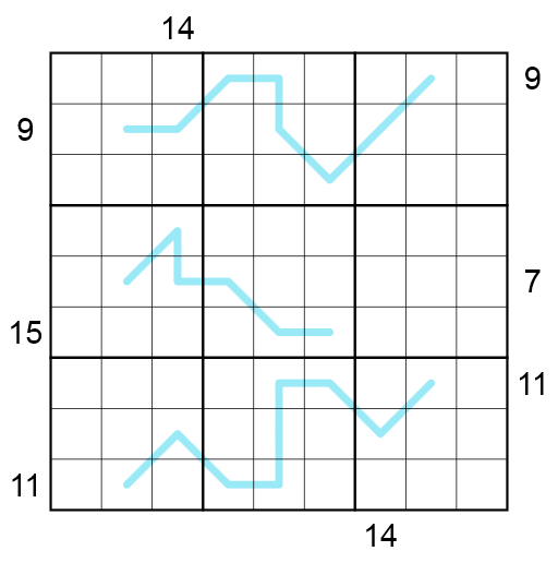- Up to N-Summen: Ein Hinweis außerhalb von Reihe oder Spalte N gibt die Summe aller Ziffern an bis zu der Zelle, welche die Ziffer N enthält. (Die Ziffer N selbst ist nicht Teil der Summe.)