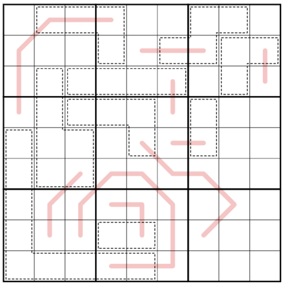 - Normal sudoku rules apply, i.e. each row, column and 3x3 region has to contain the digits from 1 to 9 once each.