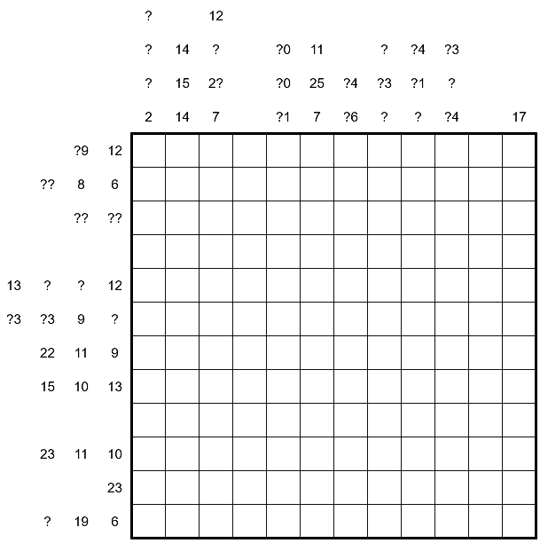 • Japanese sums: Shade some cells in the grid and fill all unshaded cells with the digits 1 to 9 such that no digit repeats in any row or column. Clues outside the grid indicate the sums of the continuous segments of unshaded cells in that row or column, in the correct order. There must be at least one shaded cell separating two segments. In each row and column, either all sums are given or no sums are given. A '?' represents any digit 0 to 9, but no clue may have a leading 0.