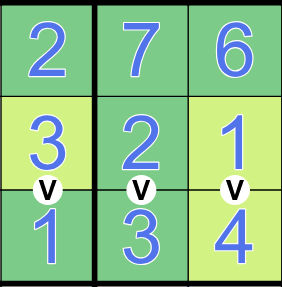 | Example: Dark green is shaded and light green is unshaded. Values on a V sum to 5. When shaded is doubled, the outer two V clues are correct and the centre V clue is incorrect. When unshaded is doubled, the centre V clue is correct and the outer two V clues are incorrect. |